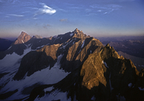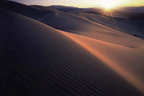 It was the summer of ’73. The day before I’d made the long trek down to the desert in Owens Valley to retrieve a buried food cache. Now back high in the Sierras, after following the John Muir Trail for a few hours, I branched off the beaten track, as is my preference, across high and open country. Later in the day a strong gusty wind came up and dark clouds menaced, so I decided to make camp on the only spot available: a slightly tilted, sort-of-flat rock. After a mighty struggle with the wind-whipped tent, tying it down to small boulders, finally I was done. But just as I settled in with a hot cup of tea to relax and enjoy the storm . . . darn it all . . . the wind died, the clouds dispersed, and the sun came out! With an easy peak beckoning to the east and a full moon on the way, there was nothing to do but put my boots back on . . . and head up. Two-thirds up I looked back and beheld . . . the few remaining clouds drifting across an immeasurably vast space . . . the windswept surface of the lakes far below . . . and a ruby sun nestling gently into a notch in the distant peaks . . . and took a photograph . . . of the Whole thing. On the summit, with hardly a breath of wind, I sat for a few hours . . . surrounded by mountains, lakes, and an infinite array of stars . . . waiting for the moon to rise high enough to guide me down.