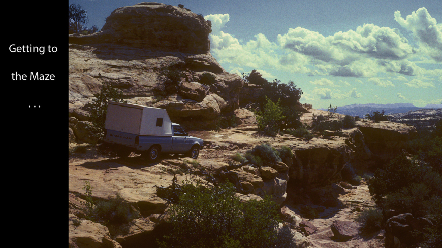 This is my first four-wheel-drive pickup, a gift from my father. I made the photo into a card and mailed it to him with the words “Thanks!” This is on the way to the Maze on the most rugged four-wheel-drive stretch I’ve seen. Two times coming off a rock ledge the front wheel bearings were damaged — but fortunately we made it home. Always check your wheel bearings for play after driving over such a road. If damaged they could actually overheat and the whole axle fall off.