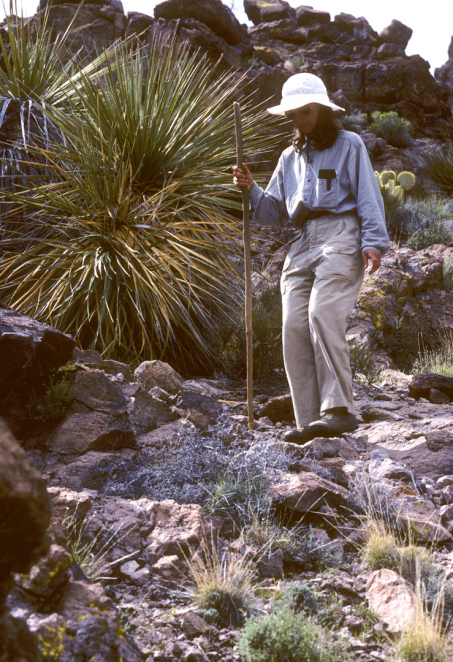 Anne in proper desert attire — except for the hiking stick which we later retired in favor of trekking poles — with their killer wrist straps.