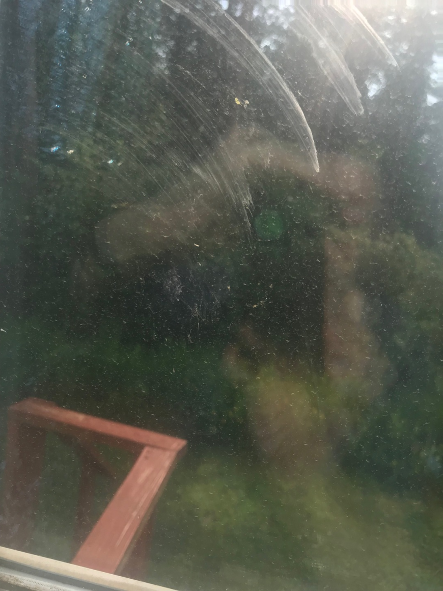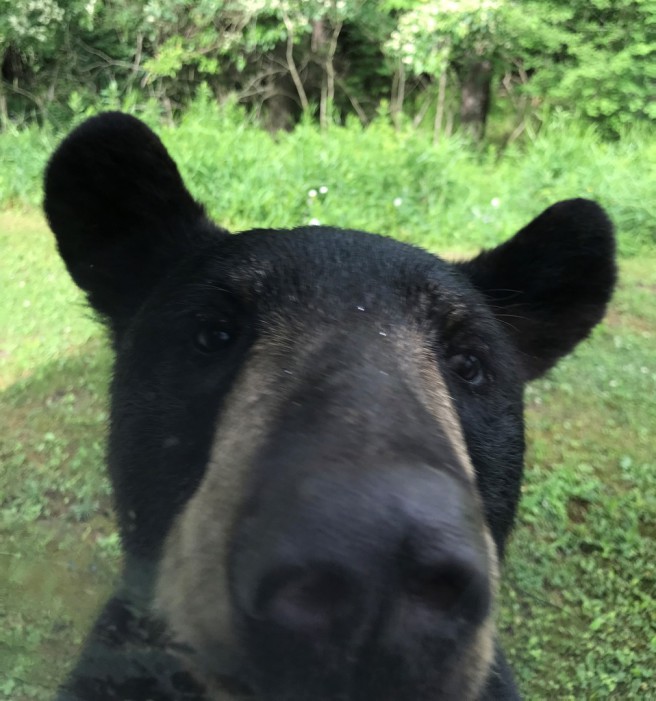 We had stopped feeding the birds a long time ago because of the bears, which the New York State Department of environmental conservation advises (for people living in densely wooded rural areas like us). But our neighbors to the west and the east still feed the bears — I mean the birds. I regularly see their scat in the yard and every few months I see them crossing the clearing to the northwest of our house. So last month I saw a baby, possibly a yearling, and presumably the mother crossing. But when the mother got halfway across she looked up at our house, and thought to herself, "Hey, maybe they've got a birdfeeder up there, too." So she changed direction and made straight for our front door. From there she went around to the garage, but then she came back to the living room window where I snapped this photo. It was fun up until now, but then she went up on the porch, climbed up on the bench on the right side of the porch and tried to get in the window — which was fully open! — right next to it! She even put her paw marks on the window. See below. At this point I started yelling at her, "Go away. Go away!" and banging two pieces of wood together… and she did at that point depart from the scene. I have since installed iron bars across that window — since I like to keep it open all summer — and the same with two basement windows. Haven't seen them since… and the neighbors keep feeding the bears — I mean the birds.