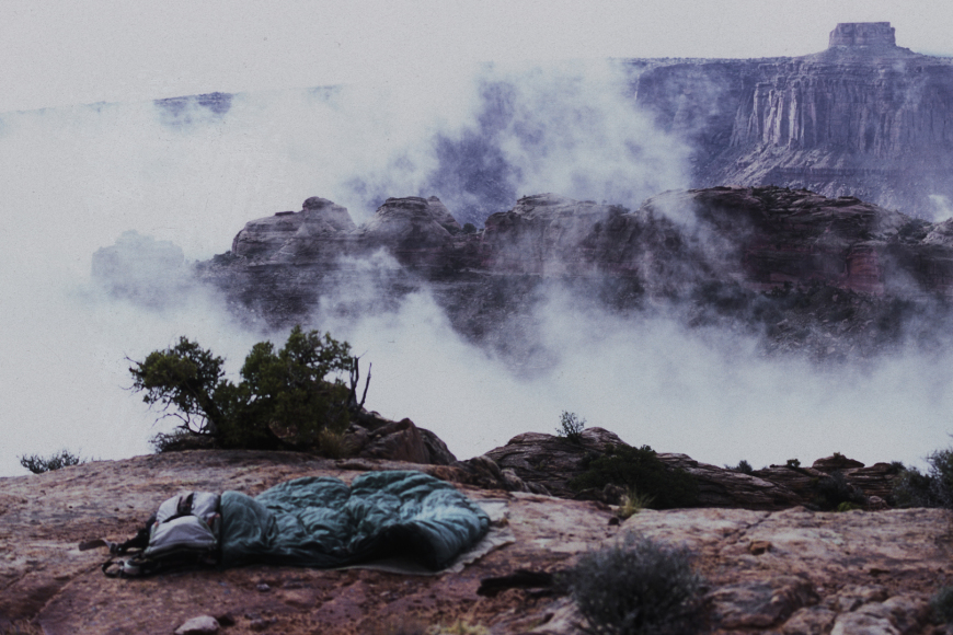 “It was a glorious spring day: The night before snowflakes had been flying, but this day was warm and clear, with blue sky, red rock, and the white, snow-draped dome of Navajo Mountain rising seventy-five miles to the south. I exulted in the unbounded space. . . . My final night I camped at a location as other¬worldly as it gets; supernal beauty far stranger than anyone could ever imagine. This was my favorite place . . . before discovering Cabeza . . . . To my right, far off, the snowy La Sal Mountains. To my left, the less distant Redwall, the “Land’s End” where I’d parked, with a line of green juniper and pinion pine along the top. In front, the rising pillars of the Chocolate Drops; a reasonably accurate description except the rock from which they were formed, and in fact on which I also now sat, was a far more beautiful rich reddish-brown than any candy bar. Directly below, between me and the Drops, were the intricate canyons of the Maze itself, all creamy white with horizontal stripes of red. And above, rich blue sky tending from pale yel¬lowish-blue where the sun had set . . . to deep violet in the east. I slept beneath the stars as I had every night except those in the cave. . . .”
